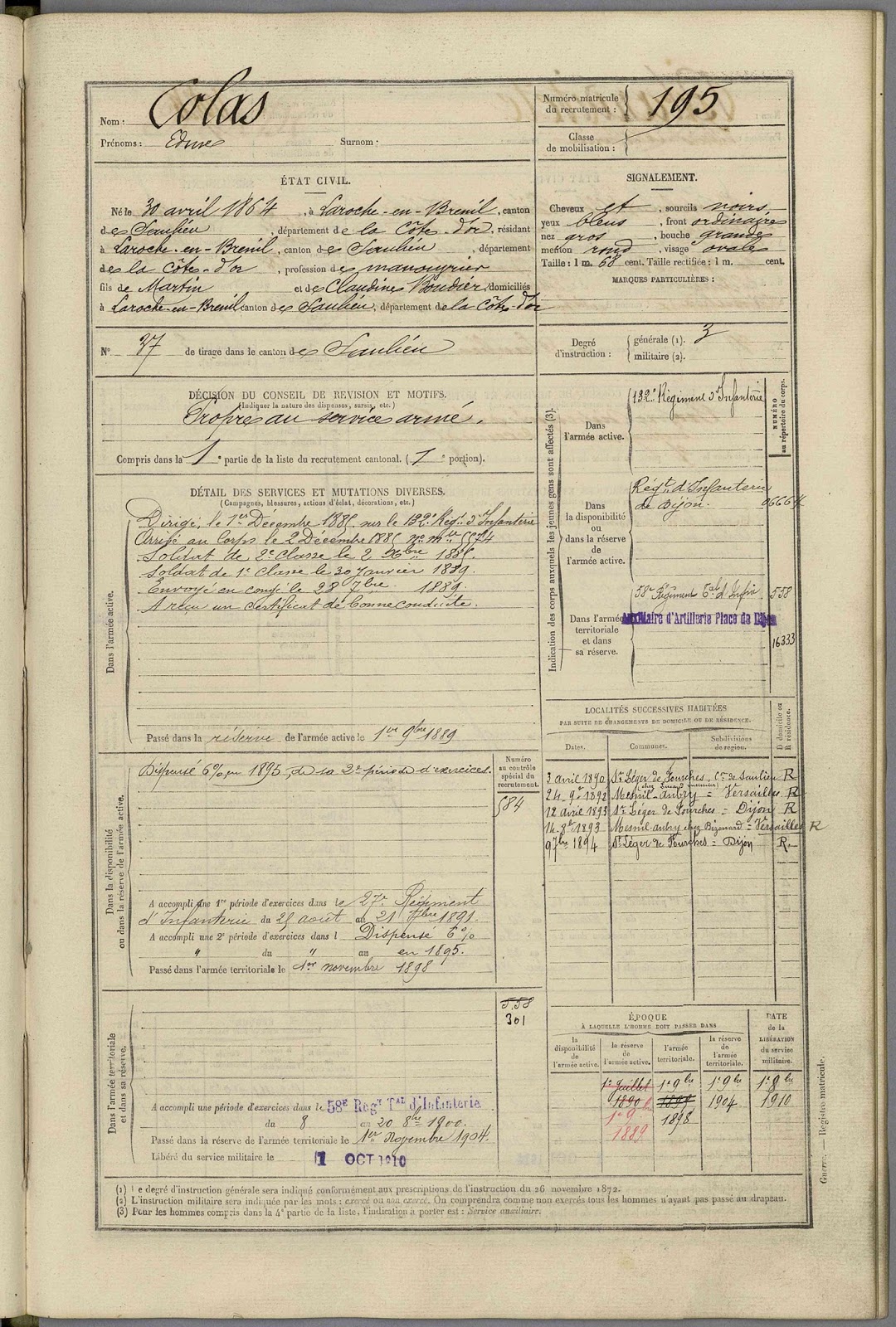 On le retrouve, avec le prénom Edme, à Dijon en 1884, au bureau de recrutement militaire. Sa fiche matricule* nous donne des informations sur son parcours militaire et quelques informations sur son apparence physique : il avait les cheveux noirs, les yeux bleus et mesurait 1,68 m.